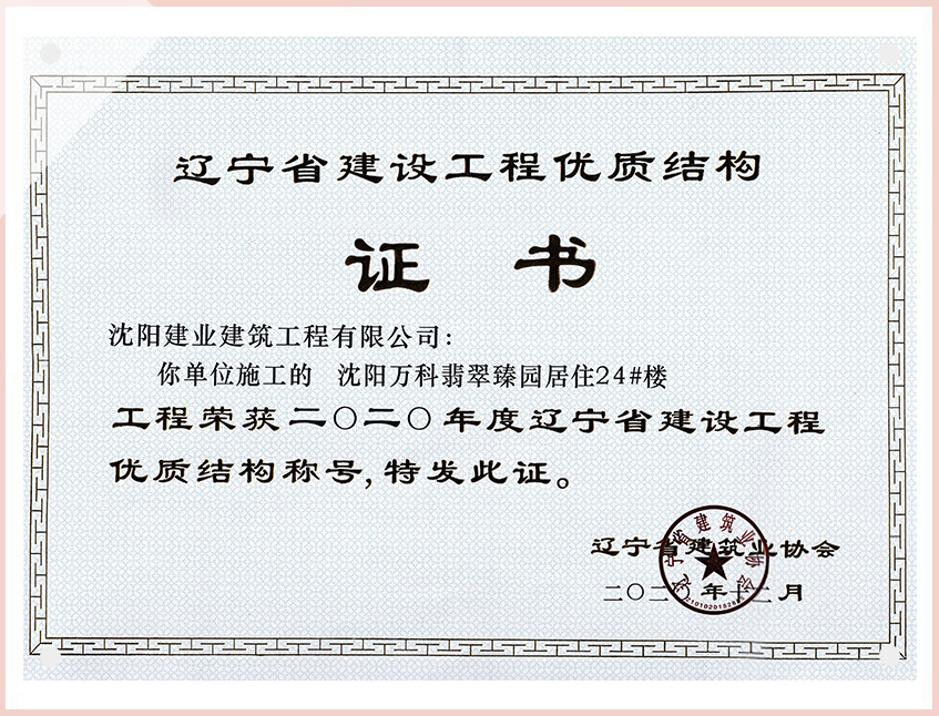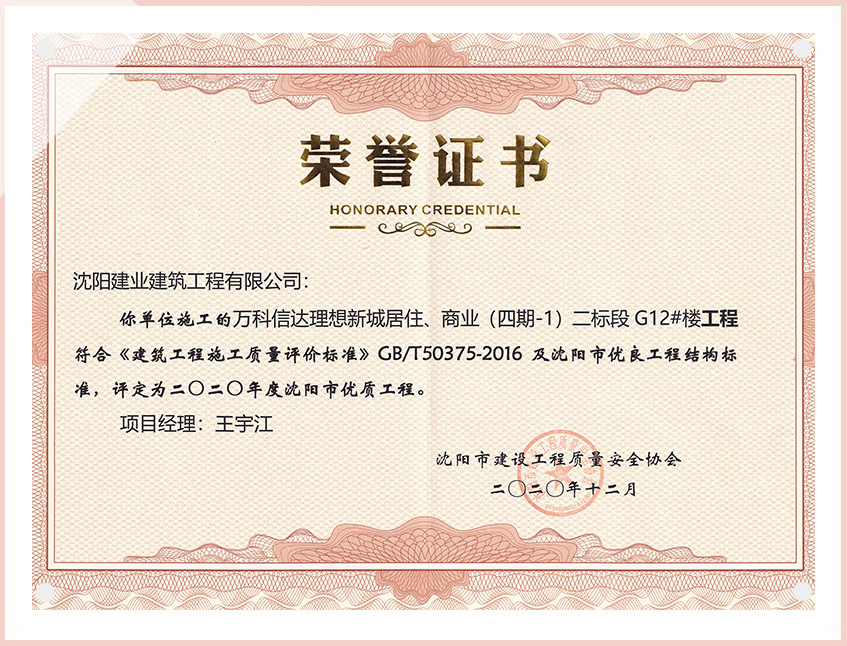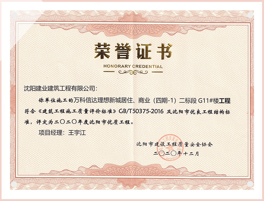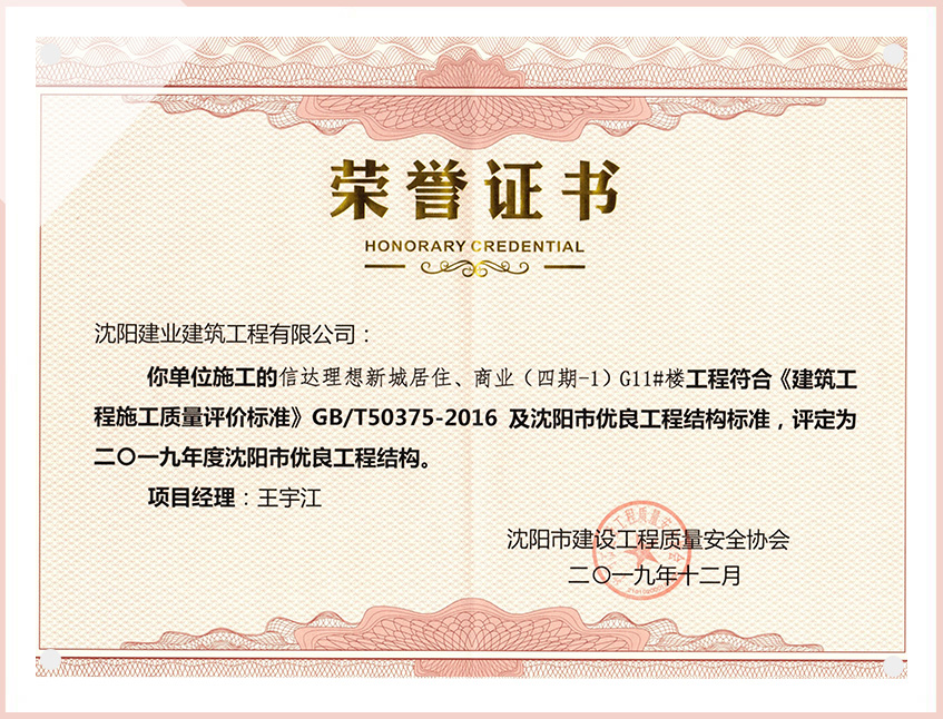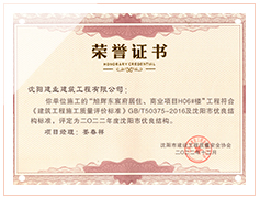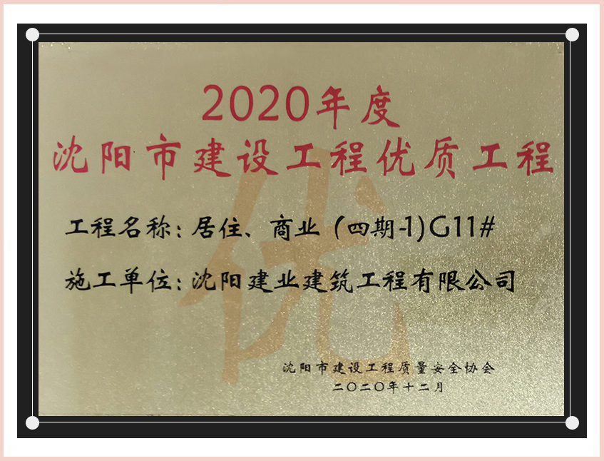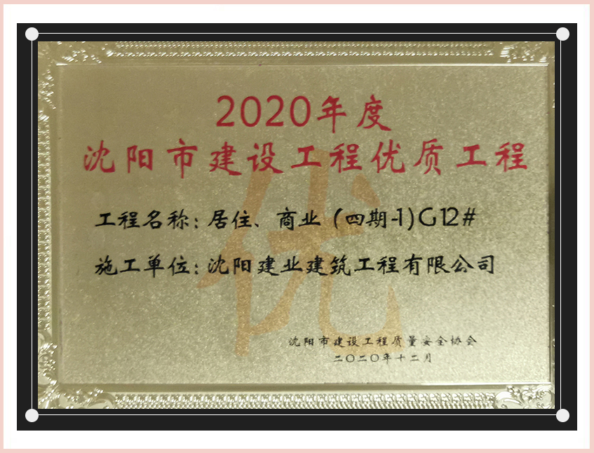 工程質(zhì)量多次進(jìn)入遼寧省前十名,其中多個項目獲得“遼寧省優(yōu)質(zhì)結(jié)構(gòu)”、“沈陽市優(yōu)質(zhì)結(jié)構(gòu)”、“沈陽市優(yōu)良工程”、“新貌杯”、“玫瑰杯”、“沈長哈三市優(yōu)質(zhì)金杯獎”、“沈陽市民營企業(yè)規(guī)模百強”、“沈陽市模范勞動關(guān)系和諧企業(yè)”、“沈陽市先進(jìn)施工單位”等多項獎項。