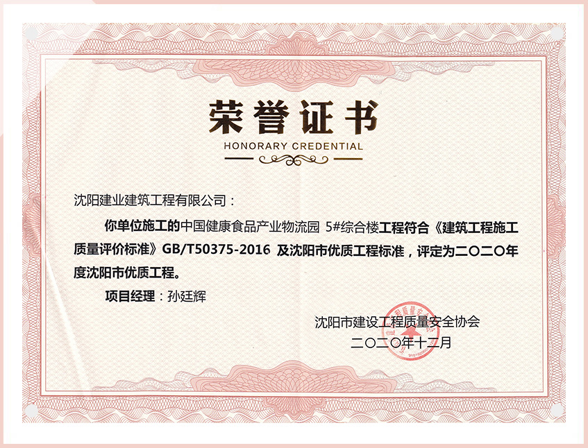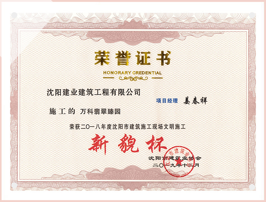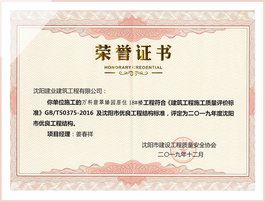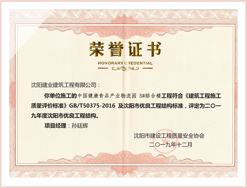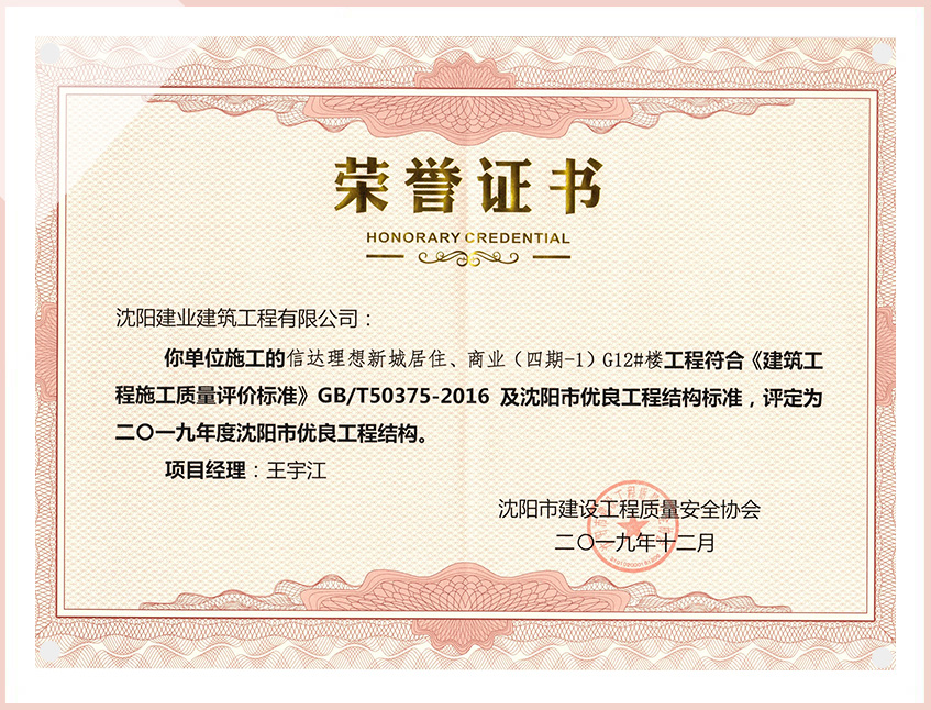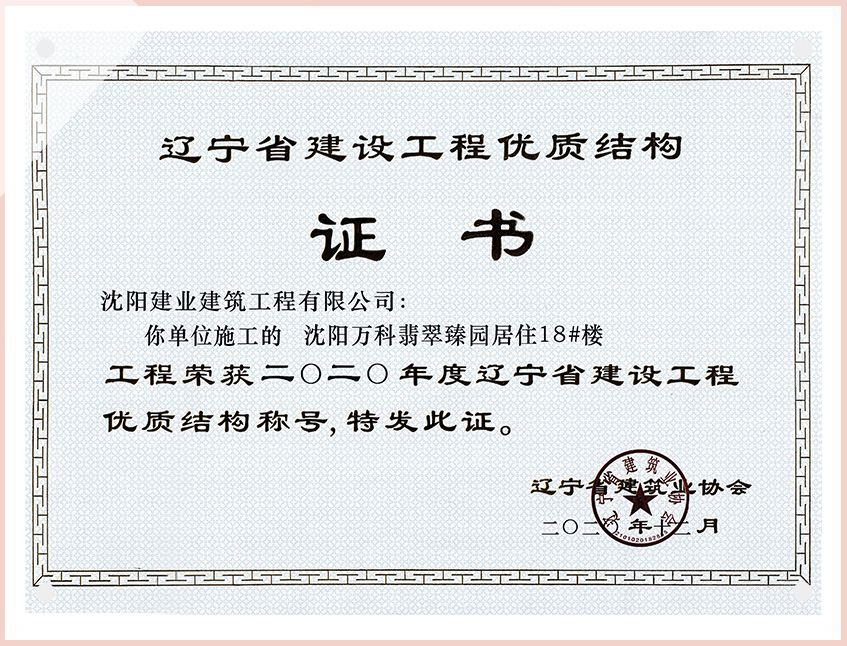 工程質(zhì)量多次進(jìn)入遼寧省前十名,其中多個項目獲得“遼寧省優(yōu)質(zhì)結(jié)構(gòu)”、“沈陽市優(yōu)質(zhì)結(jié)構(gòu)”、“沈陽市優(yōu)良工程”、“新貌杯”、“玫瑰杯”、“沈長哈三市優(yōu)質(zhì)金杯獎”、“沈陽市民營企業(yè)規(guī)模百強”、“沈陽市模范勞動關(guān)系和諧企業(yè)”、“沈陽市先進(jìn)施工單位”等多項獎項。